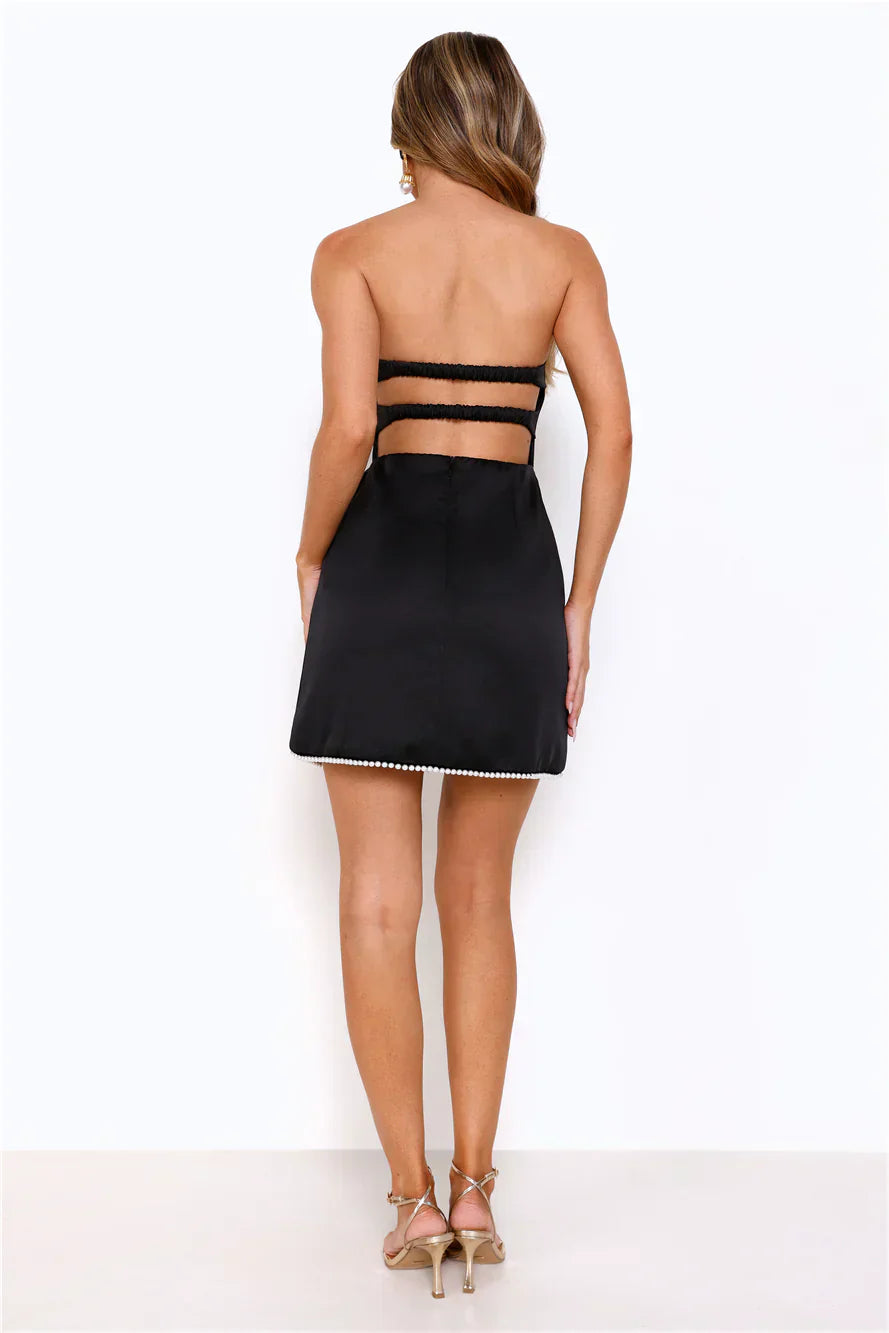 Designed for the party girls. The Sassy Sparks Strapless Satin Mini Dress features a gorgeous faux pearl beaded trim and a small split to the skirt. Style with heels and curls!